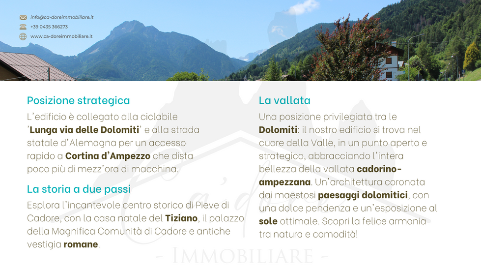 Vieni a scoprire un'opportunità straordinaria di vivere tra le maestose Dolomiti! Questo affascinante edificio, dotato di solide strutture verticali e orizzontali, è pronto per una ristrutturazione leggera che trasformerà gli spazi esistenti in 16/20 eleganti residenze. La posizione baricentrica e panoramica nel cuore della valle cadorino-ampezzana offre un'esperienza unica, con un paesaggio dolomitico da sogno e una generosa esposizione al sole. Grazie a un accurato studio di fattibilità, rispetteremo l'architettura originale, riducendo al minimo le demolizioni murarie e concentrandoci sulle rifiniture. Le residenze, dislocate tra il piano primo e il piano sottotetto, si adatteranno perfettamente alle tue esigenze e stile di vita. Il piano terra sarà dedicato a una spaziosa autorimessa e a servizi complementari come un'area fitness o una sala giochi per momenti di svago. Inoltre, avrai la possibilità di sviluppare ulteriori spazi abitativi sfruttando la volumetria residua consentita di 3500 mc, realizzabili in tre villette o due di più grandi dimensioni, nell'area circostante. La tua futura dimora è qui, dove la tradizione e la modernità si incontrano per creare uno stile di vita senza paragoni. Non perdere questa occasione di entrare a far parte di una comunità esclusiva di residenze raffinate nelle Dolomiti.